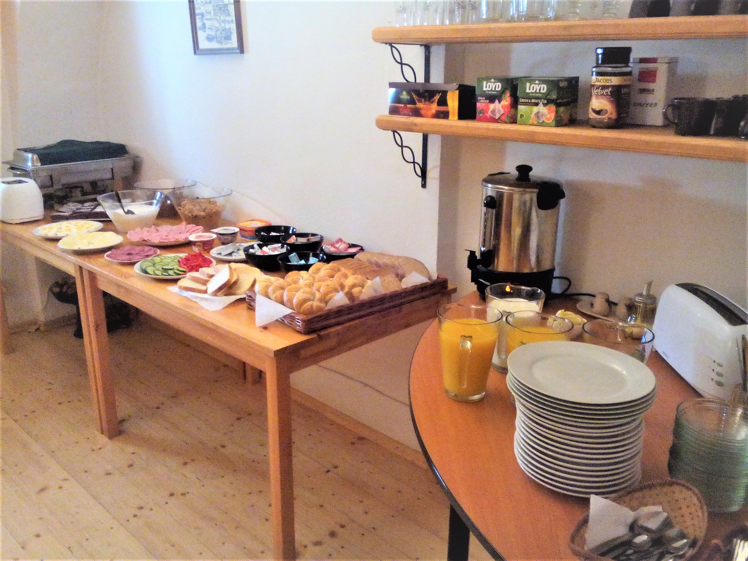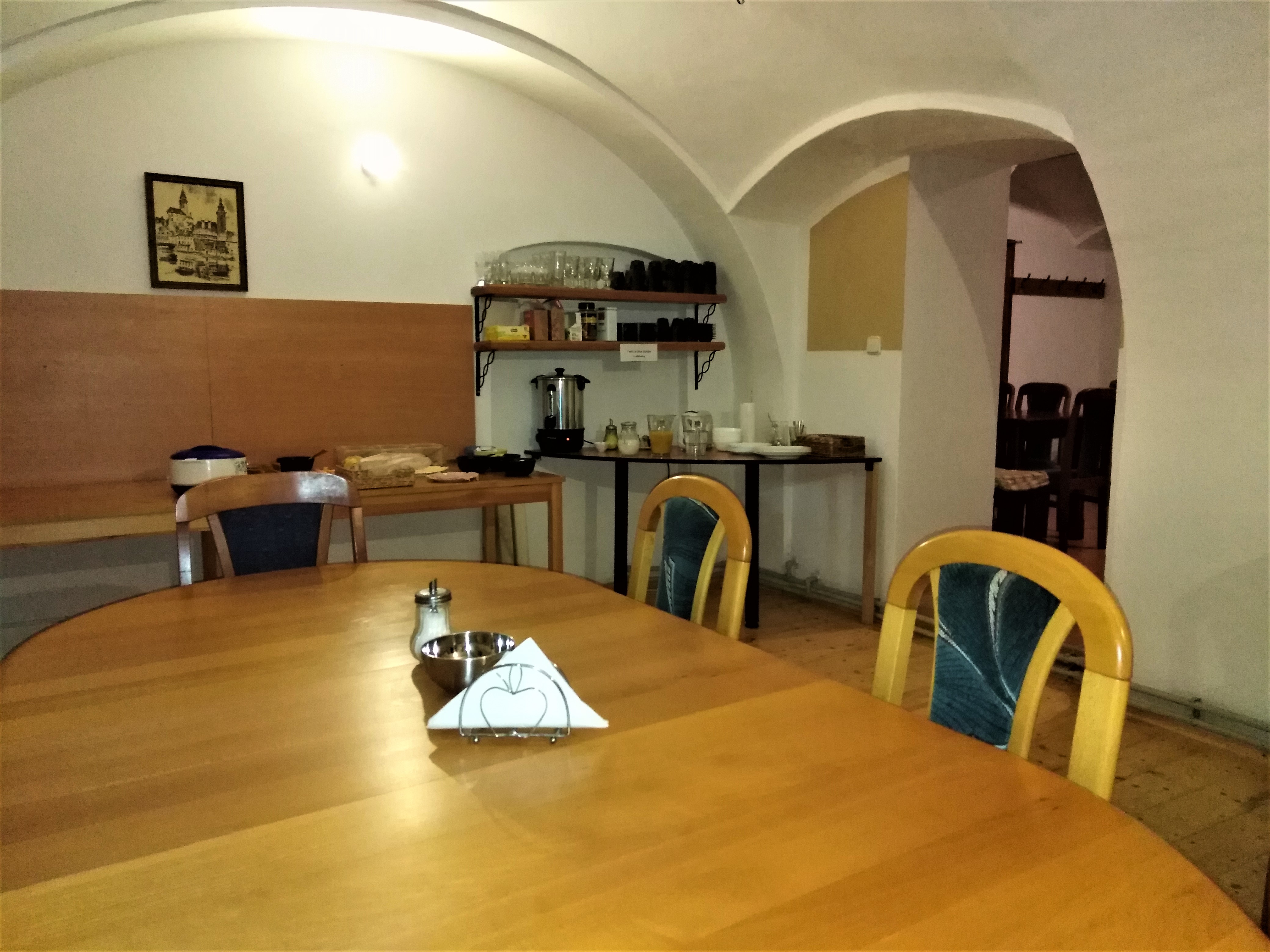 Snídaně formou bufetu. Zohledňujeme roční období, skladbu ubytovaných hostů a případně i jejich denní program. V nabídce jak uzeniny a bílé pečivo, tak i jogurty, musli, cereálie a celozrnné pečivo. Z nápojů několik druhů kvalitních čajů a kávy. Nabídku dolpňují 100% ovocné džusy a neperlivá voda je samozřejmostí.K tomu střídavě vejce v různých podobách, párky, nebo jiné teplé uzeniny. Závěrem čerstvé pečivo a nějaká sladká tečka. Snídaně jsou standardně k dispozici od 8 do 9.30 hod, kdy jsou stoly doplňovány tak, aby i "spáči" měli všeho dost. Snídat můžete v restauraci, na venkovním posezení kam ráno vychází slunce, nebo si snídani můžete odnést na zahradu.